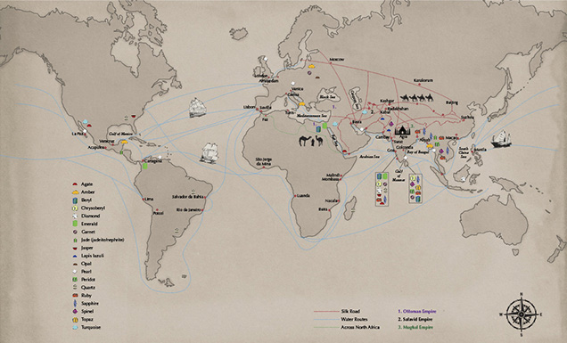The map in Figure 2 shows where different gems that are on the Taj Mahal came from. Notice how the trade routes include both land and sea routes, and how they stretch all the way to the Americas and Japan. South Asian Merchants also traded Spices like cinnamon, Black pepper, cloves, nutmeg, mace, and ginger, among others. These spices used to be quite expensive to consume outside of South Asia. Some of the most prevalent merchant communities included the Buddhist, Jain, Parsi (Zoroastrian), and Ismaili communities.